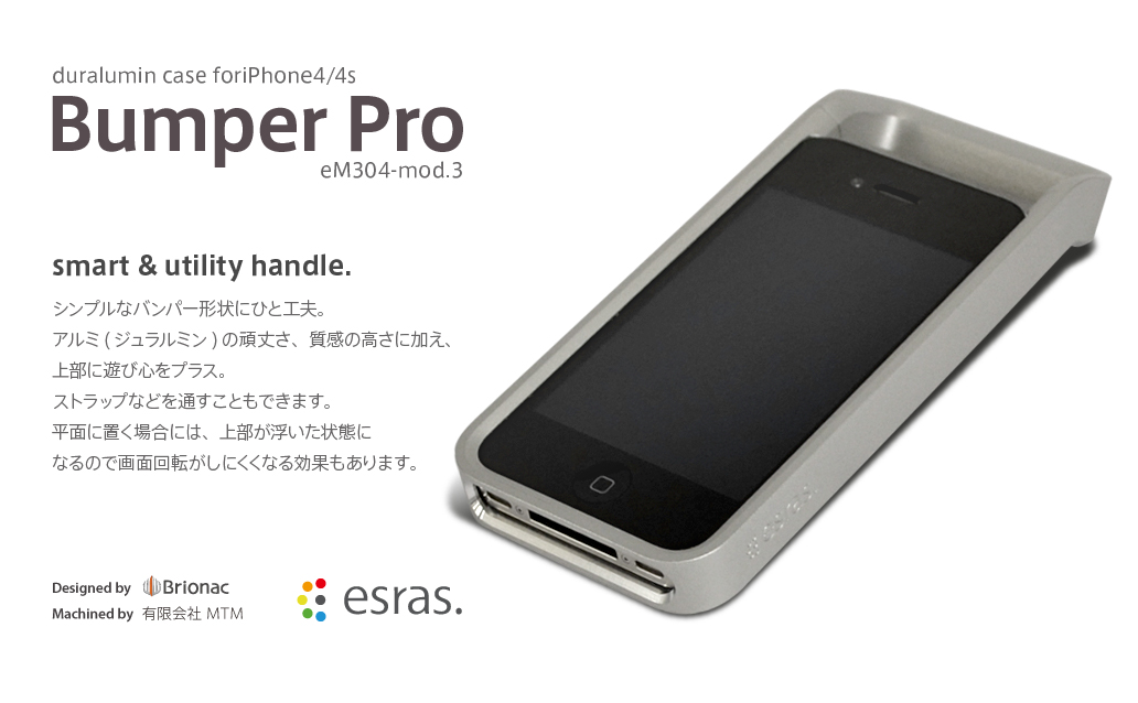 仕様 型番 eM-304 mod.2/mod.3 サイズ 高さ:144.6mm 幅:63.3mm 奥行き:24mm 重さ:N/A 素材 アルミニウム(ジュラルミン) 表面処理 化研・ショットブラスト・アルマイト 付属品 ネジ2本 専用レンチ マニュアル 対応機種 mod.2:iPhone4mod.3:iPhone4/4S 税込価格 ¥19,900- *注 ・本製品はApple社iPhone4/4S用です。他の用途に使用しないでください。 ・頑丈なアルミ製ケースですが、iPhoneの安全を完全に保証するものではありません。 ・電源ケーブルによってはケースをつけたままケーブルを挿す事ができないものがあります。