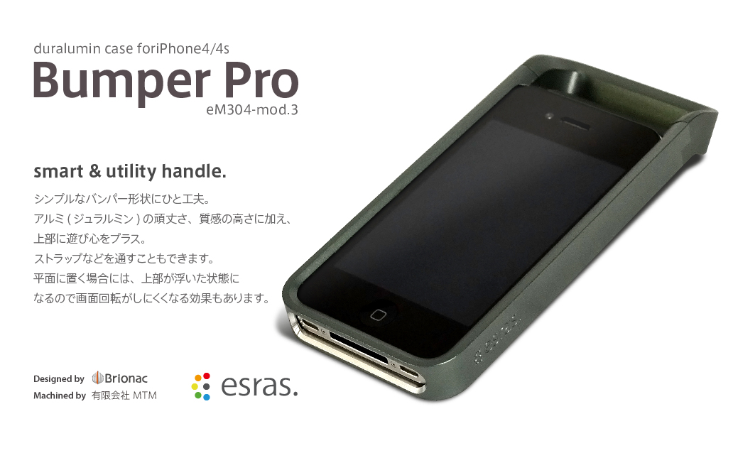 仕様 型番 eM-304 mod.3-FB ~ Foliage green サイズ 高さ:144.6mm 幅:63.3mm 奥行き:24mm 重さ:N/A 素材 アルミニウム(ジュラルミン) 表面処理 化研・ショットブラスト・アルマイト 付属品 ネジ2本 専用レンチ マニュアル 対応機種 iPhone4/4S 税込価格 ¥19,900- *注 ・本製品はApple社iPhone4/4S用です。他の用途に使用しないでください。 ・頑丈なアルミ製ケースですが、iPhoneの安全を完全に保証するものではありません。 ・電源ケーブルによってはケースをつけたままケーブルを挿す事ができないものがあります。