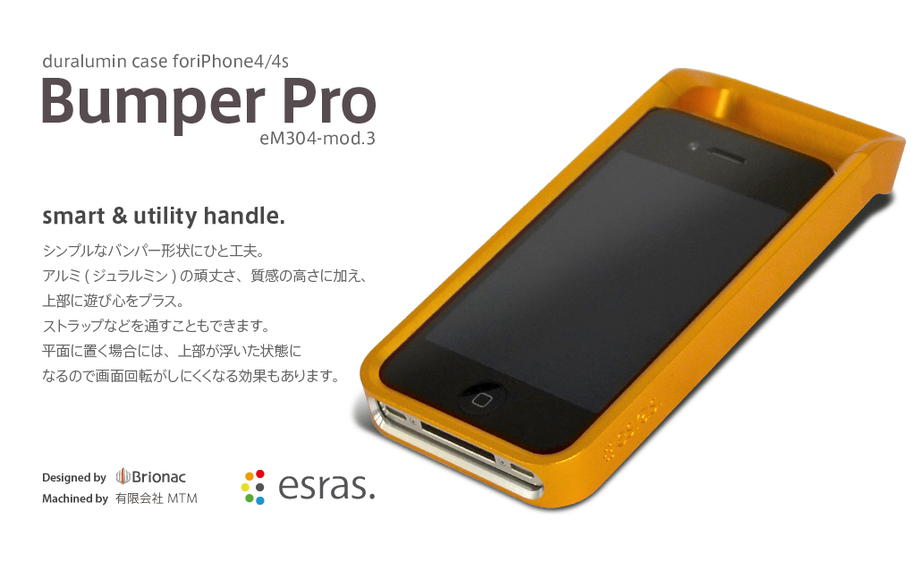 仕様 型番 eM-304 mod.3-FG ~ Fire gold サイズ 高さ:144.6mm 幅:63.3mm 奥行き:24mm 重さ:N/A 素材 アルミニウム(ジュラルミン) 表面処理 化研・ショットブラスト・アルマイト 付属品 ネジ2本 専用レンチ マニュアル 対応機種 iPhone4/4S 税込価格 ¥19,900- *注 ・本製品はApple社iPhone4/4S用です。他の用途に使用しないでください。 ・頑丈なアルミ製ケースですが、iPhoneの安全を完全に保証するものではありません。 ・電源ケーブルによってはケースをつけたままケーブルを挿す事ができないものがあります。