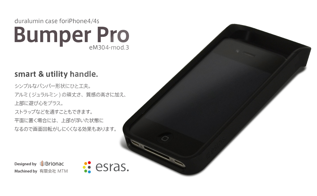 仕様 型番 eM-304 mod.2/mod.3 ~ Black サイズ 高さ:144.6mm 幅:63.3mm 奥行き:24mm 重さ:N/A 素材 アルミニウム(ジュラルミン) 表面処理 化研・ショットブラスト・アルマイト 付属品 ネジ2本 専用レンチ マニュアル 対応機種 mod.2:iPhone4mod.3:iPhone4/4S 税込価格 ¥19,900- *注 ・本製品はApple社iPhone4/4S用です。他の用途に使用しないでください。 ・頑丈なアルミ製ケースですが、iPhoneの安全を完全に保証するものではありません。 ・電源ケーブルによってはケースをつけたままケーブルを挿す事ができないものがあります。